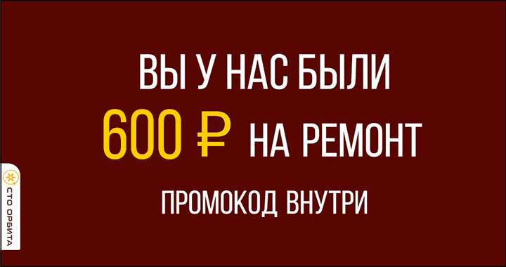 За регистрацию в личном кабинете СТО Орбита дарит 600 рублей для оплаты работ по обслуживанию, диагностике, слесарному ремонту, а также шиномонтажа. Промокод приходит после регистрации в личном кабинете и не распространяется на юридические лица и не действует на хранение резины / колес. Сообщите его мастеру в любой момент до закрытия заказ-наряда. Скидочными баллами можно оплатить не более 30% стоимости заказ-наряда (работа + запчасти). Неиспользованный остаток остается на вашем бонусном счету и может быть применен при следующем визите.